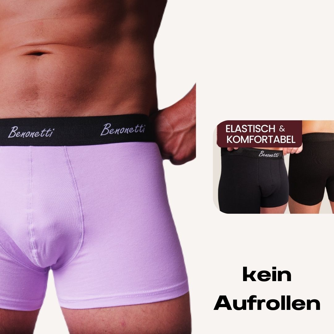 Boxershorts sollten weder zu eng noch zu weit sein. Eine gute Passform sorgt für Bewegungsfreiheit, ohne dass der Stoff einschneidet oder verrutscht. Es gibt unterschiedliche Schnitte (loose-fit, slim-fit), je nach persönlicher Vorliebe. Die Boxershorts von Benonetti sind enganliegend und der Bund ist breiter geschnitten, um das Einschneiden zu vermeiden. Durch die optimale Schnittlänge ist das Hochrutschen in der Hose kaum möglich.
