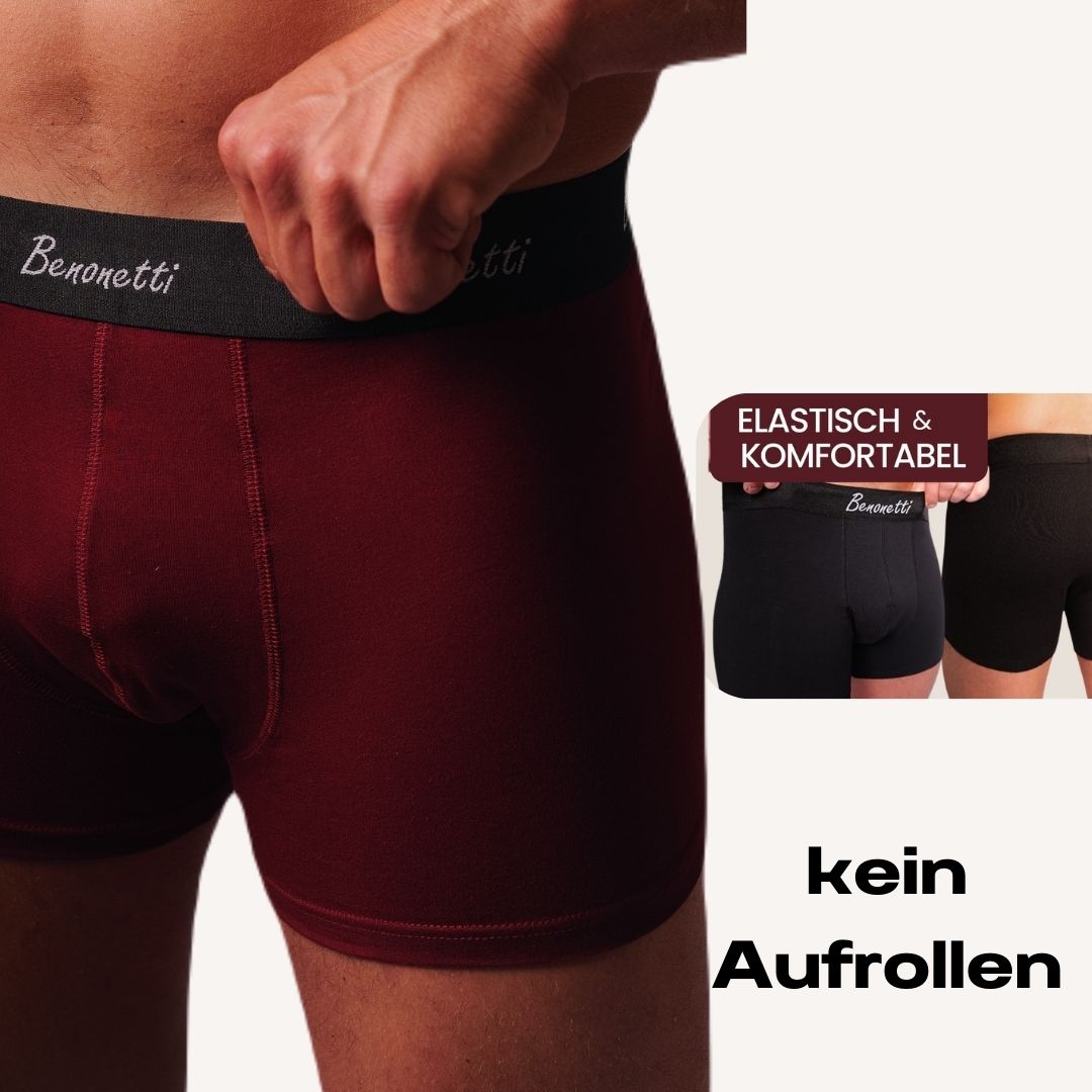 Boxershorts sollten weder zu eng noch zu weit sein. Eine gute Passform sorgt für Bewegungsfreiheit, ohne dass der Stoff einschneidet oder verrutscht. Es gibt unterschiedliche Schnitte (loose-fit, slim-fit), je nach persönlicher Vorliebe. Die Boxershorts von Benonetti sind enganliegend und der Bund ist breiter geschnitten, um das Einschneiden zu vermeiden. Durch die optimale Schnittlänge ist das Hochrutschen in der Hose kaum möglich.